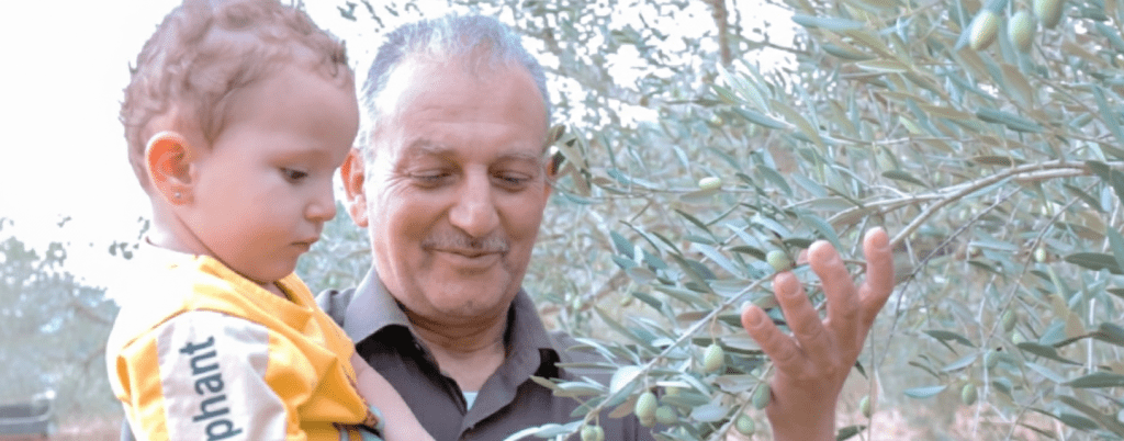 Ghassan Abu Malla proudlyshows his granddaughterthe olives during the 2024 harvest.